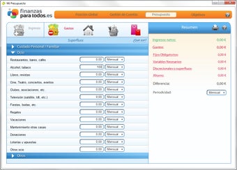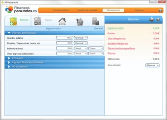 La parte de Presupuesto es la que más variantes ofrece y la parte clave para llevar las cuentas al día. En Presupuesto es donde se imputan todos los gastos e ingresos del hogar: suelods, pagas extras, indemnizaciones, ingresos financieros, inversiones, gastos del hogar, gastos superfluos, etcétera...