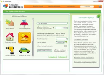 Por último, Mi presupuesto incluye un bloque llamado Objetivos. En él se pueden incluir objetivos financieros de diversa índole. Por ejemplo, podemos añadir como objetivos un coche, una nueva vivienda, un viaje, una boda o la jubilación. Así, se debe introducir la cantidad objetivo, así como el tiempo requerido para alcanzarla y el programa nos indica el camino a seguir.