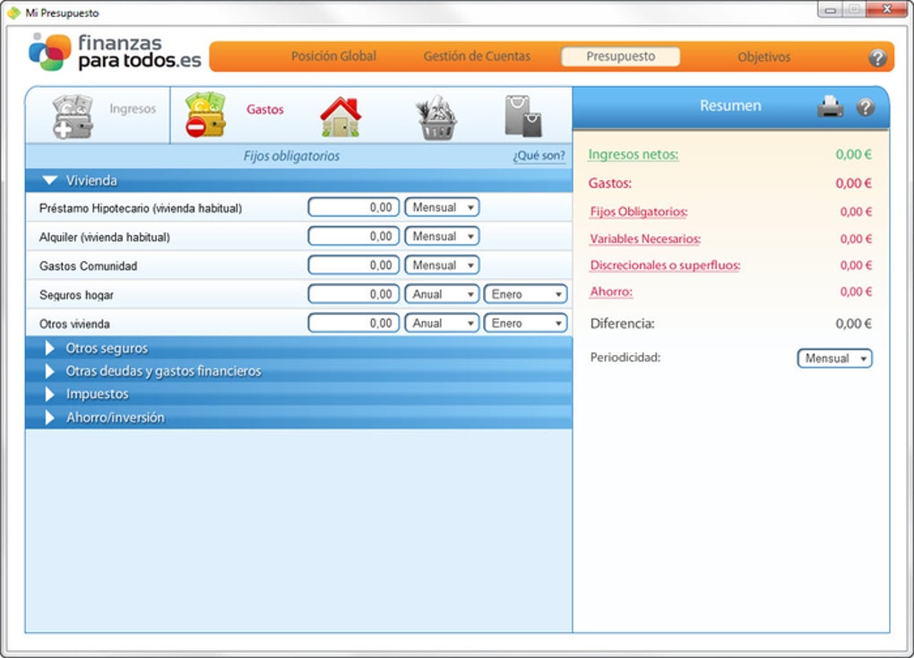 La parte de Presupuesto es la que más variantes ofrece y la parte clave para llevar las cuentas al día. En Presupuesto es donde se imputan todos los gastos e ingresos del hogar: suelods, pagas extras, indemnizaciones, ingresos financieros, inversiones, gastos del hogar, gastos superfluos, etcétera...