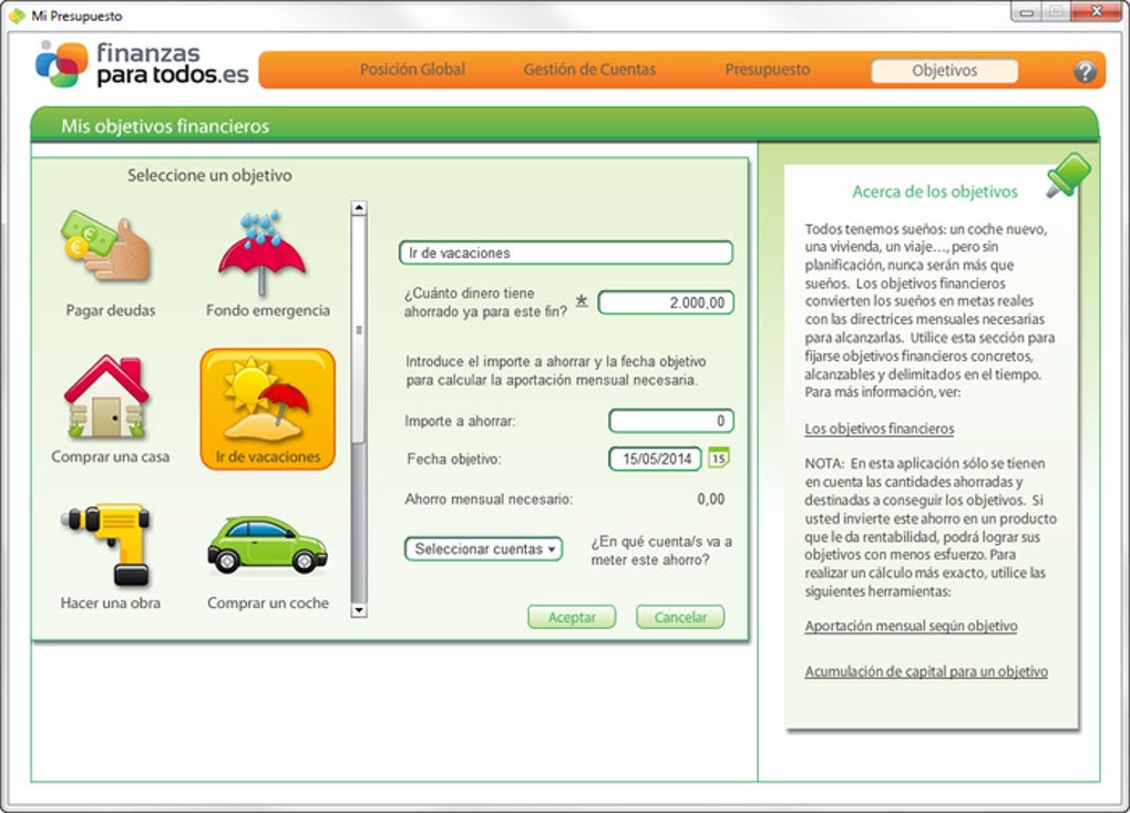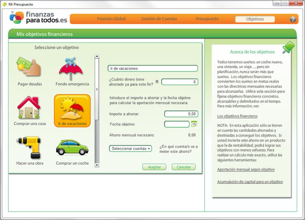 Por último, Mi presupuesto incluye un bloque llamado Objetivos. En él se pueden incluir objetivos financieros de diversa índole. Por ejemplo, podemos añadir como objetivos un coche, una nueva vivienda, un viaje, una boda o la jubilación. Así, se debe introducir la cantidad objetivo, así como el tiempo requerido para alcanzarla y el programa nos indica el camino a seguir.